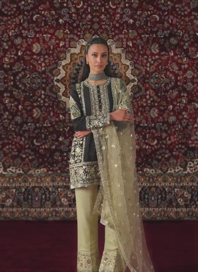 Our Black and Gold Embroidered Organza Pant Suit includes an organza top with santoon inner, crepe bottom with santoon inner, and a net dupatta. Embroidery is present on this style using zari, sequins, and thread work.