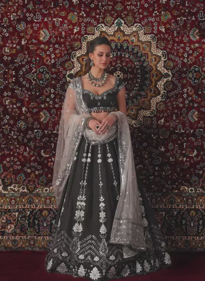 Our Black and White Embroidered Viscose Silk Lehenga includes a viscose silk top with santoon inner, a viscose silk bottom with santoon inner, and a net dupatta. Embroidery is present on this style using zari, thread, applique, and sequins work.