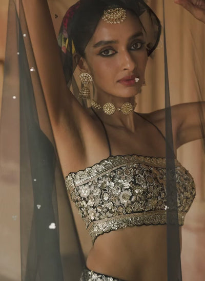 Our Black Embroidered Brocade Lehenga includes a brocade top, brocade bottom, and a net dupatta. Embroidery is present on this style using thread, stone, zari, and hand work.