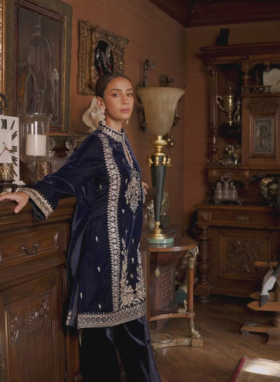 Our Blue Embroidered Velvet Pant Suit includes a velvet top, santoon bottom, and a net dupatta. Embroidery is present on this style using thread, zari, sequins, stone, and hand work.