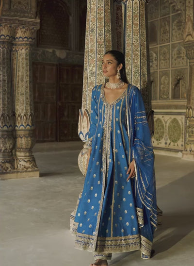 Our Blue Embroidered Anarkali Style Palazzo includes a brocade top, santoon bottom, and a net dupatta. Embroidery is present on this style using thread, stone, zari, and hand work.