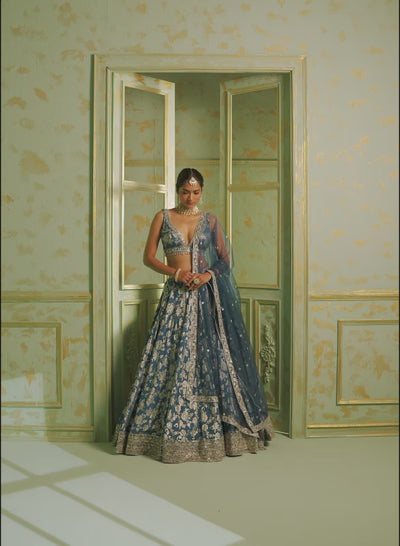 Our Blue Embroidered Brocade Lehenga includes a silk top, silk with santoon inner bottom, and a net dupatta. Embroidery is present on this style using thread, zari, and stone work.