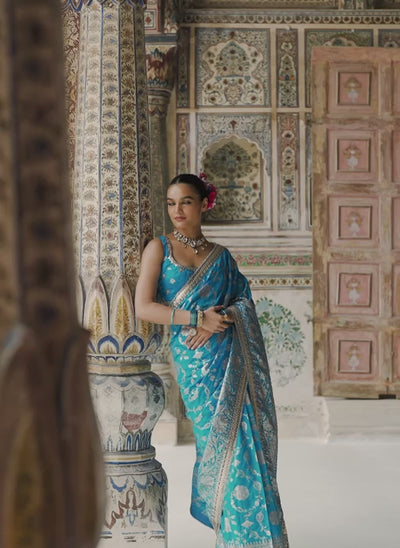 Our Blue Embroidered Brocade Saree includes a silk top and a brocade saree. Embroidery is present on this style using thread, zari, stone, and hand work.