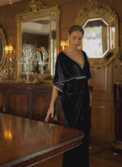 Our Blue Embroidered Velvet Kaftan includes a velvet kaftan with a santoon bottom. Embroidery is present on this style using zari, sequins, and stone work.