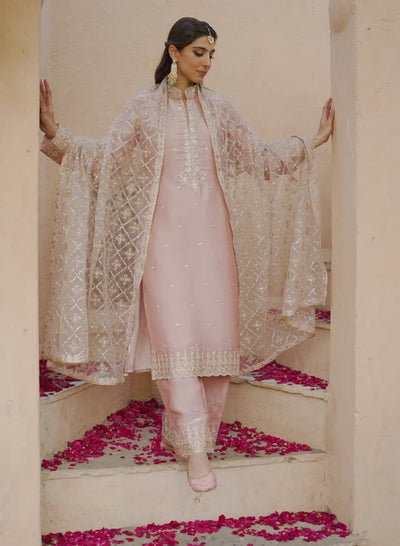Our Blush Pink Embroidered Palazzo Suit includes an organza top with santoon inner, organza bottom with santoon inner, and a net dupatta. Embroidery is present on this style using zari, sequins, and thread work.
