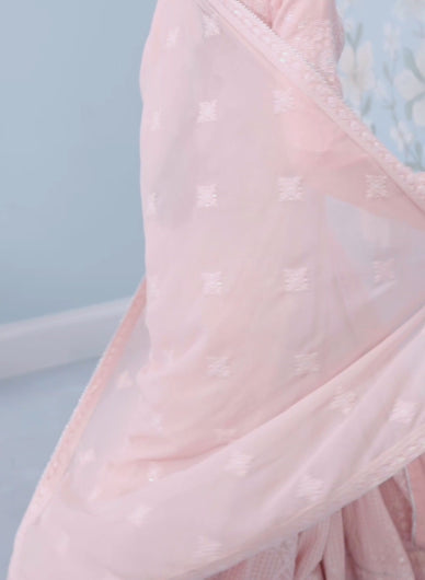 Our Blush Pink Thread Embroidered Anarkali is the embodiment of elegance and beauty, and perfect for this hot summer season. The pishwas features a beautiful blend of meticulously handcrafted thread and sequin embroideries against a pure georgette fabric. The set has been completed with a matching dupatta with subtly worked detailing and a thick chatta patti border stitched across all the four sides.