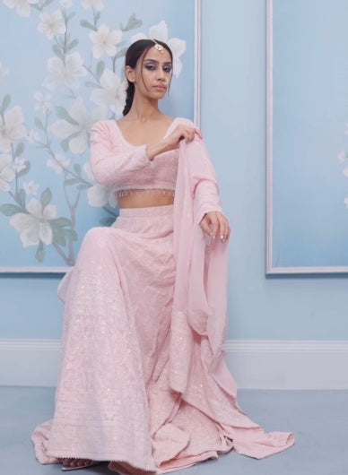 Our Blush Pink Thread Embroidered Lehenga can be rocked at any desi event from Sangeet nights to festivities to family get togethers. The cropped embroidered choli has been paired with a matching kalidar lehenga with densely embellished detailing of thread and sequin across sheer georgette fabric. The look has been  rounded off with a matching dupatta with elaborate floral motifs all across the daman.