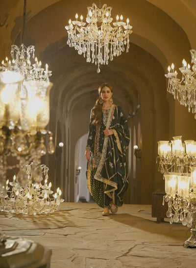 Our Bottle Green Embroidered Punjabi Suit includes a satin top with santoon inner, brocade bottom, and a silk dupatta. Embroidery is present on this style using zari, sequins, and thread work.