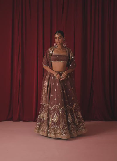 Our Brown Embroidered Tissue Lehenga includes a tissue top with satin inner, tissue bottom with satin inner, and a tissue dupatta. Embroidery is present on this style using cording, sequins, and zari.