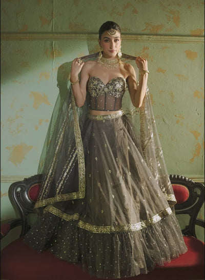 Our Dark Grey Embellished Corset Style Lehenga includes a net top, net with santoon inner bottom, and a net dupatta. Embroidery is present on this style using thread, zari, and stone work.
