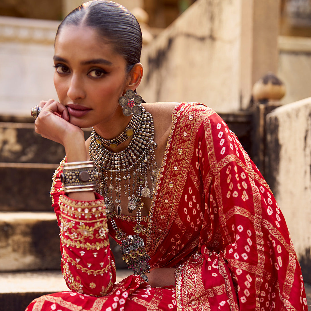 A perfect choice for any wedding events, our Red Orange and Teal Peplum Style Anarkali has been thoughtfully curated keeping in mind the fashion needs of today's brides. The a-line knee length shirt has a jaal of tilla work on the neckline followed by a plain daman and finished with a subtly embroidered hem. The silk shirt is paired with skin-fit trousers with worked hems and buttons. The ensemble is worn with a teal net dupatta highlighted with a lace sewn on all the sides.