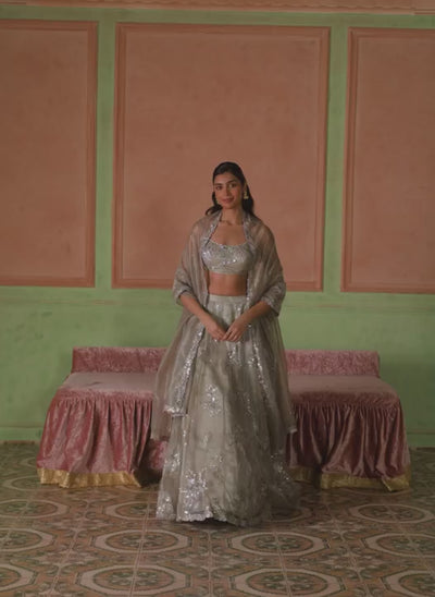 Our Dusty Grey Embroidered Net Lehenga includes a net top with santoon inner, net bottom with santoon inner, and a net dupatta. Embroidery is present on this style using sequins, zari, and stone work.