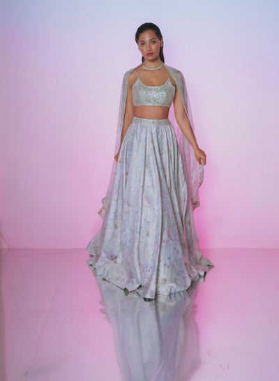 Our Dusty Lilac Floral Embellished Lehenga includes a net top, silk lehenga, and a tabby silk dupatta. Embroidery is present on this style using thread, stone, print, and hand work.