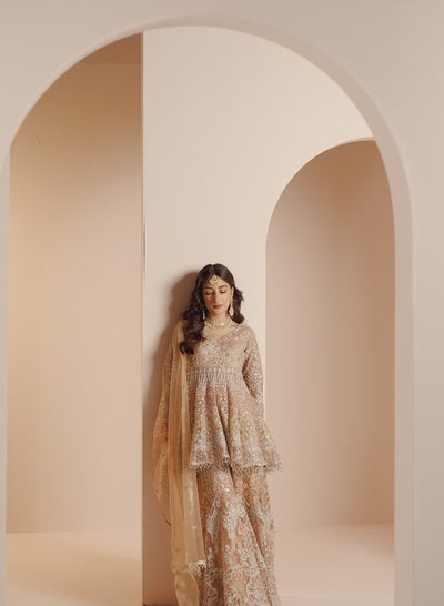 Dusty Peach Embroidered Sharara Suit includes a net top with santoon inner, net bottom with santoon inner, and a net dupatta. Embroidery is present on this style using zari, sequins, and stone work.