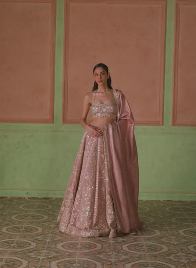 Our Dusty Pink Embroidered Silk Lehenga includes a silk top with santoon inner, silk bottom with santoon inner, and a brocade dupatta. Embroidery is present on this style using sequins, cording, zari, hand embellishments, and thread work.