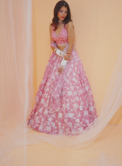 Our Dusty Pink White Floral Printed Lehenga includes a chanderi top, chanderi lehenga, and a chanderi dupatta. Embroidery is present on this style using print and stone work.