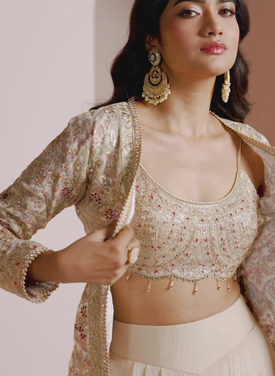 Our Golden Beige Embroidered Crop Jacket Set includes a net top with satin inner, chiffon bottom with satin inner, and a net with satin inner jacket. Embroidery is present on this style using zari, sequins, and stone work.