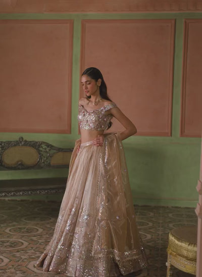 Our Golden Beige Embroidered Net Lehenga includes a net top with satin inner, net bottom with satin inner, and a net dupatta. Embroidery is present on this style using sequins, zari, and hand embellishments.