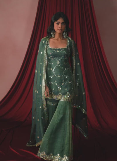 Our Green Embroidered Tissue Gharara includes a tissue top with santoon inner, tissue bottom with santoon inner, and a tissue dupatta. Embroidery is present on this style using cording, sequins, and zari.
