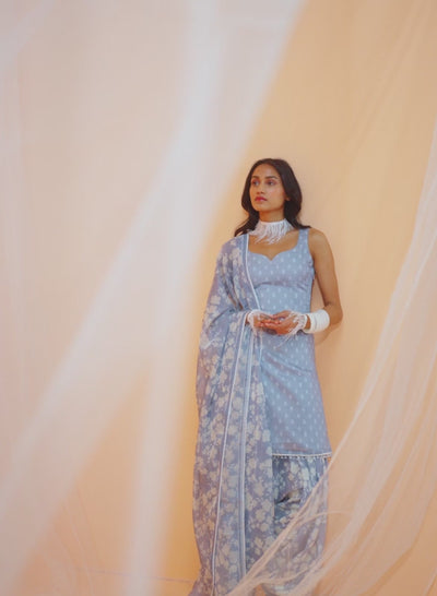 Our Grey White Floral Printed Punjabi Suit includes a chanderi top, chanderi bottom, and a chanderi dupatta. Embroidery is present on this style using print and stone work.