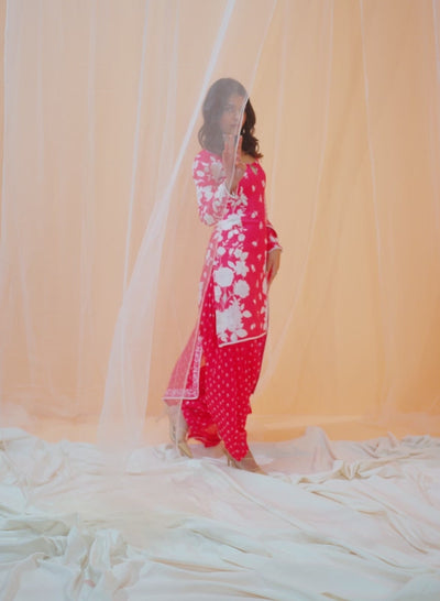 Our Hot Pink White Floral Printed Straight Suit includes a chanderi top, chanderi bottom, and a chanderi dupatta. Embroidery is present on this style using print and stone work.