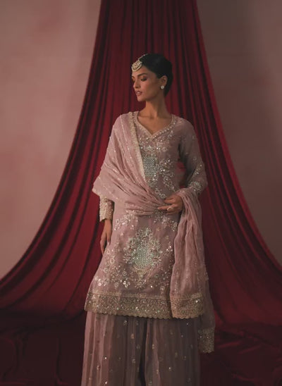Our Lavender Embroidered Tissue Sharara Suit includes a tissue top with satin inner, tissue bottom with satin inner, and a tissue dupatta. Embroidery is present on this style using cording, sequins, and zari.