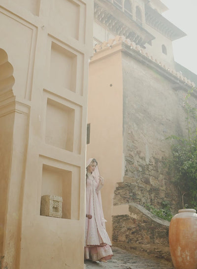 Our Light Pink Embroidered Anarkali Style Sharara includes a georgette top with santoon inner, santoon bottom, and a georgette dupatta. Embroidery is present on this style using zari, sequins, thread, and handwork.
