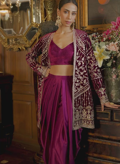 Our Magenta Embroidered Velvet Suit With Jacket includes a velvet top, satin bottom, and a velvet jacket. Embroidery is present on this style using thread, zari, sequins, and stone work.