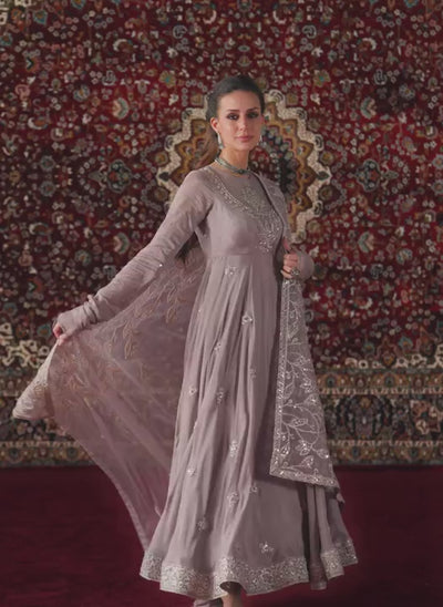 Mauve Grey Embroidered Crepe Anarkali