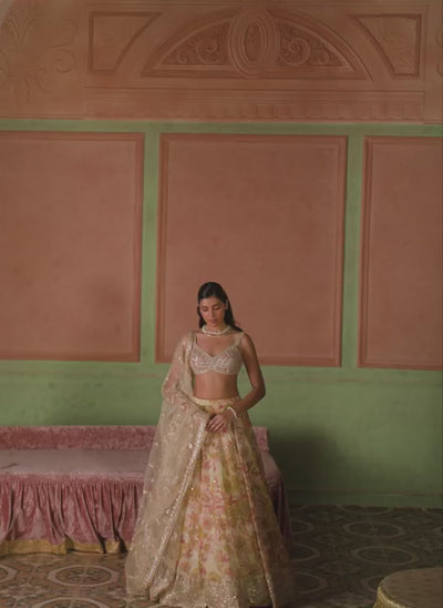 Our Multicolor Cream Floral Printed Lehenga includes a net top with santoon inner, net bottom with santoon inner, and a net dupatta. Embroidery is present on this style using zari, sequins, and hand embellishments.