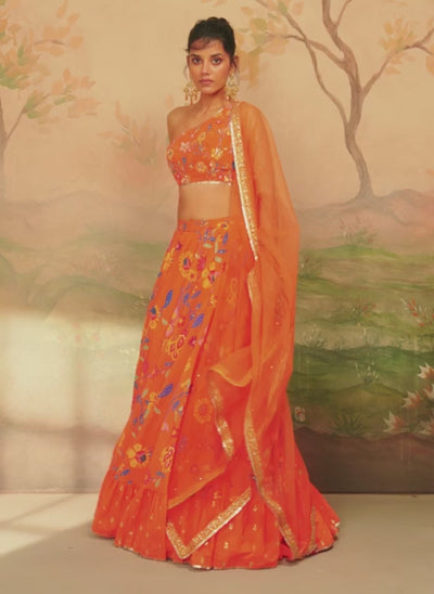 Our Orange Floral Printed Lehenga includes a georgette top, georgette with satin inner bottom, and a net dupatta. Embroidery is present on this style using thread, stone, print, zari, and hand work embellishments.