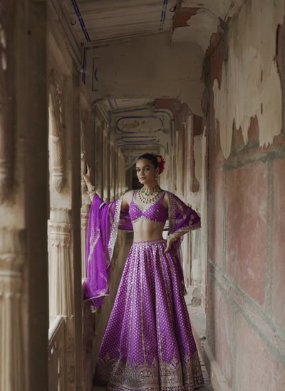 Our Purple Embroidered Brocade Lehenga includes a brocade top with satin inner, brocade with satin inner bottom, and a net dupatta. Embroidery is present on this style using thread, stone, zari, and hand work.