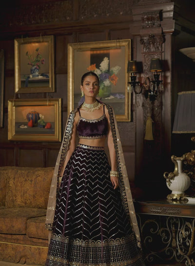 Deep Purple Embroidered Velvet Lehenga