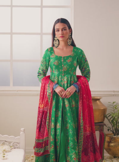 Our Red and Green Floral Printed Pant Style Anarkali includes a satin top with santon inner, satin bottom, and satin velvet dupatta. Embroidery is present on this style using print and pearl lace embellishments.