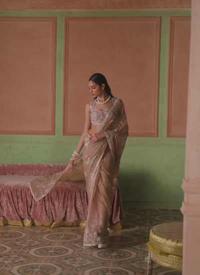 Our Rose Gold Embroidered Organza Saree includes an organza top with crepe inner, and an organza saree with crepe inner. Embroidery is present on this style using thread, appliques work, and hand embellishments.