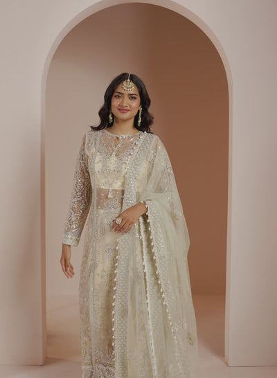 Our Soft Yellow Embroidered Lehenga includes a net top with satin inner, net bottom with satin inner, and a net dupatta. Embroidery is present on this style using zari, sequins, and stone work.