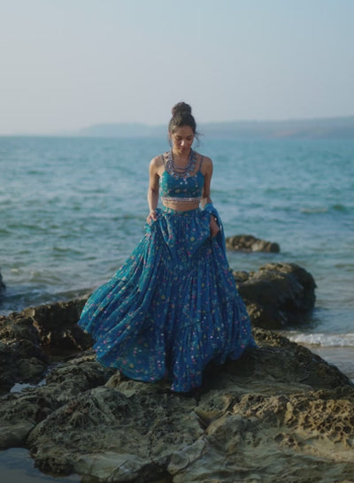 Our Teal Floral Printed Lehenga includes a georgette top, georgette bottom, and georgette dupatta. Embroidery is present on this style using print, stone, and hand work.