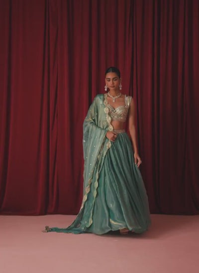 Our Teal Green Embroidered Satin Lehenga includes a satin top with satin inner, satin bottom with satin inner, and a satin dupatta. Embroidery is present on this style using cording, sequins, and zari.