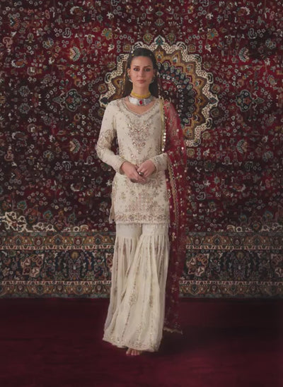 Our White and Maroon Embroidered Georgette Gharara includes a georgette top with santoon inner, georgette bottom with santoon inner, and a net dupatta. Embroidery is present on this style using zari, sequins, thread and handwork embellishments.