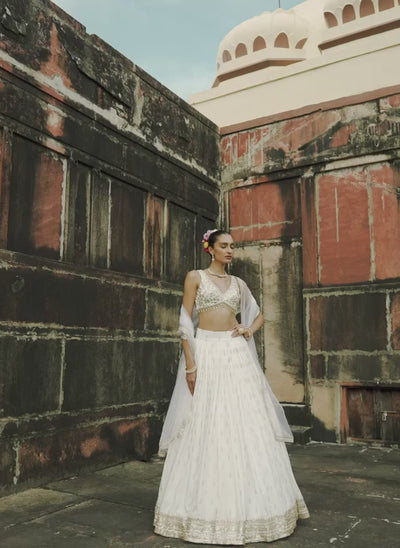 Our White Embroidered Brocade Lehenga includes a brocade top, brocade with crepe inner bottom, and a net dupatta. Embroidery is present on this style using thread, zari, stone, and hand work.