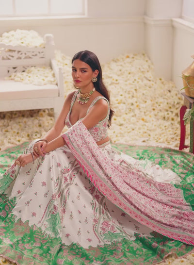 Our White Multicolor Floral Printed Lehenga includes a satin top with santoon inner, satin bottom with santoon inner, and satin velvet dupatta. Embroidery is present on this style using print, cotton thread,  pearl lace embellishments and handwork beaded latkans.