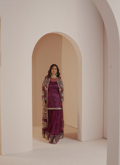 Our Wine Embroidered Sharara Suit includes a net top with satin inner, net bottom with satin inner, and a net with satin inner jacket. Embroidery is present on this style using zari, sequins, and stone work.